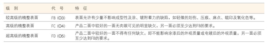 針對(duì)國(guó)內(nèi)鋼廠無(wú)法生產(chǎn)超高級(jí)精整表面質(zhì)量鋼板(O5板)的現(xiàn)狀,寶鋼積極組織生產(chǎn)、科研方面的人員大力攻關(guān),在國(guó)內(nèi)首先開發(fā)出了O5板這一冷軋精品,并實(shí)現(xiàn)了穩(wěn)定批量供貨,極大地滿足了汽車用戶的需求。目前寶鋼生產(chǎn)的低碳及超低碳鋼板不僅被廣泛地用于制作汽車的內(nèi)部零件,而且還被大量用作表面質(zhì)量要求高的轎車及客車等汽車的外覆蓋件。鋼板表面質(zhì)量分為三個(gè)級(jí)別,以滿足不同用途的要求。如下表所示: